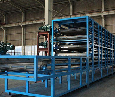 將物料均勻的平鋪在網(wǎng)帶上,網(wǎng)帶采用12-60目的鋼絲網(wǎng)帶,由傳動裝置拖動在干燥機(jī)內(nèi)往返移動,熱風(fēng)在物料間穿流而過,水蒸氣從排濕孔中排出,從而達(dá)到干燥的目的,箱體長度由標(biāo)準(zhǔn)段組合而成,為了節(jié)約烘干場地,可將烘干機(jī)制成多層式,常見的有二室三層、二室五層、長度6-80m,有效寬度0.6-3.0m。